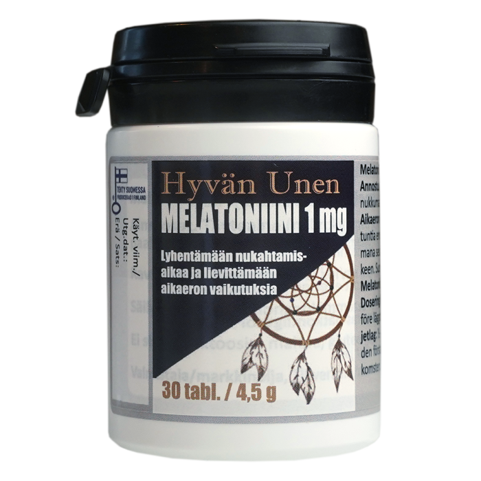 Melatoniiniravintolisä lyhentämään nukahtamisaikaa ja lievittämään aikaeron vaikutuksia. 1 tabletti sisältää 1 mg melatoniinia.