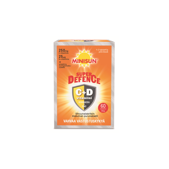 Minisun Super Defence on C- ja D3-vitamiineja sekä sinkkiä ja auringonhattu-uutetta sisältävä valmiste. Se sisältää 250 milligrammaa C-vitamiinia ja 25 mikrogrammaa D3-vitamiinia sekä sinkkiä ja auringonhattu-uutetta. Molemmat vitamiinit ylläpitävät tutkitusti vastustuskykyä, ja sinkki sekä auringonhattu-uute edistävät immuunijärjestelmän normaalia toimintaa. Lisäksi C-vitamiinin on todettu vähentävän väsymystä ja uupumusta, ja D-vitamiini on tärkeä luuston rakentaja sekä lihasten toiminnan ylläpitäjä. Minisun Super Defence sopii kuureina käytettäväksi vastustuskyvyn tueksi. Sitruunalakritsin makuinen purutabletti sopii erityisesti aikuisille. Vuorokausiannos on yhdestä kahteen purutablettia. Valmiste on maidoton, laktoositon, gluteeniton, soijaton, hiivaton ja liivatteeton.