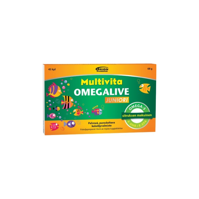 Multivita Omegalive Juniori är ett fiskoljapreparat med smak av apelsin och citron. De geléartade tuggtabletterna innehåller rikligt med omega-3-fettsyror samt D3-vitamin. Produkten innehåller enbart naturliga färg- och aromämnen. 2 tuggtabletter om dagen för barn över 3 år.