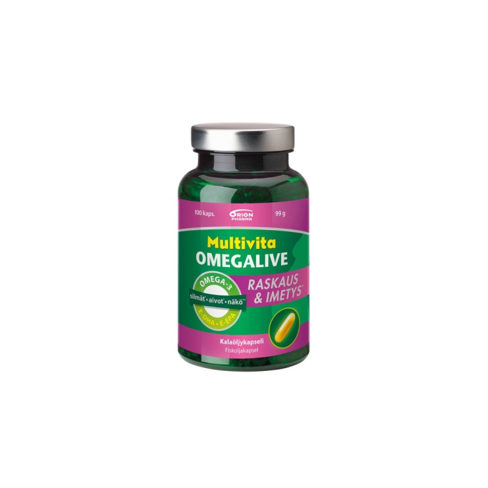Laadukas kalaöljyvalmiste on kehitetty erityisesti raskaana olevien ja imettävien tarpeisiin. Multivita Omegalive Raskaus & Imetys sisältää erityisen runsaasti odottajalle tärkeitä DHA-rasvahappoja. Pienikokoiset, soikeat kapselit ovat helppoja niellä. Valmiste ei sisällä lisättyjä vitamiineja, joten sitä voi haluttaessa käyttää yhdessä vitamiinivalmisteiden kanssa.  DHA ylläpitää sikiön ja rintaruokinnassa olevan imeväisen aivojen ja silmien normaalia kehitystä ja sen tarve on suuri erityisesti viimeisen raskauskolmanneksen aikana. Edullinen vaikutus saavutetaan nauttimalla päivittäin 200 mg DHA:ta (aikuisten omega-3-rasvahappojen saantisuosituksen lisäksi (250 mg DHA:ta ja EPA:a/vrk).