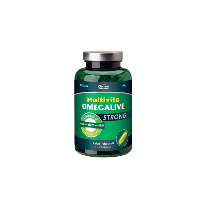 Apteekin suosituin* kalaöljyvalmiste! Päiväannostukseltaan erittäin vahva kalaöljykapseli.  Korkeasta omega-3-pitoisuudesta huolimatta kapseli on kohtuullisen kokoinen ja helppo niellä. Multivita Omegalive Strongin sisältämät tärkeät omega-3-rasvahapot DHA ja EPA tukevat sydämen normaalia toimintaa ja lisäksi DHA edistää aivojen sekä näkökyvyn normaalina pysymistä. Edullinen vaikutus näkökyvylle ja aivoille saavutetaan nauttimalla päivittäin 250 mg DHA:ta, ja sydämelle nautittaessa 250 mg DHA:ta ja EPA:a. Valmiste ei sisällä lisättyjä vitamiineja ja sopii siksi käytettäväksi yhdessä vitamiinivalmisteiden kanssa. *IQVIA Pharmacy Panel Audit MAT 6/2025