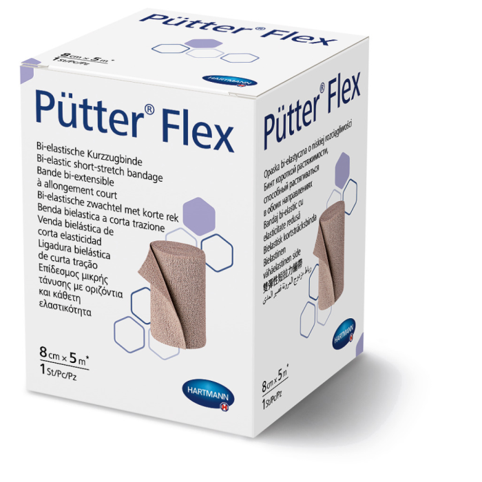 Pütter Flex® är en tvåvägs elastisk, låg-elastisk 100% bomullsväv, som kan tvättas vid 95 °C och steriliseras (ånga vid 134 °C).