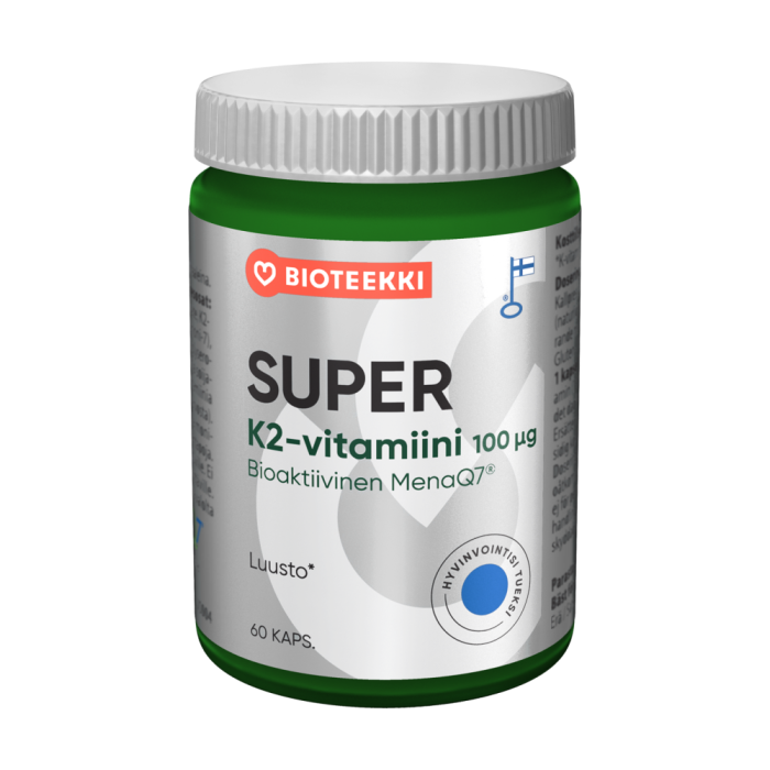 Bioteekin Super K2-vitamiini on vahva ja hyvin imeytyvä K2-vitamiini öljykapselissa. Valmiste sisältää luontaista menakinoni-7-vitamiinimuotoa kylmäpuristetussa pellavansiemenöljyssä. Kapselin sisältämä öljy edistää rasvaliukoisen K-vitamiinin imeytymistä, mistä johtuen K-vitamiinin imeytyminen on tehokasta K-vitamiini edistää luiden pysymistä normaaleina sekä edistää veren normaalia hyytymistä. Valmiste on gluteeniton, laktoositon, maidoton ja soijaton. Tuotteella on Valmistettu Suomessa -Avainlippu-tunnus.