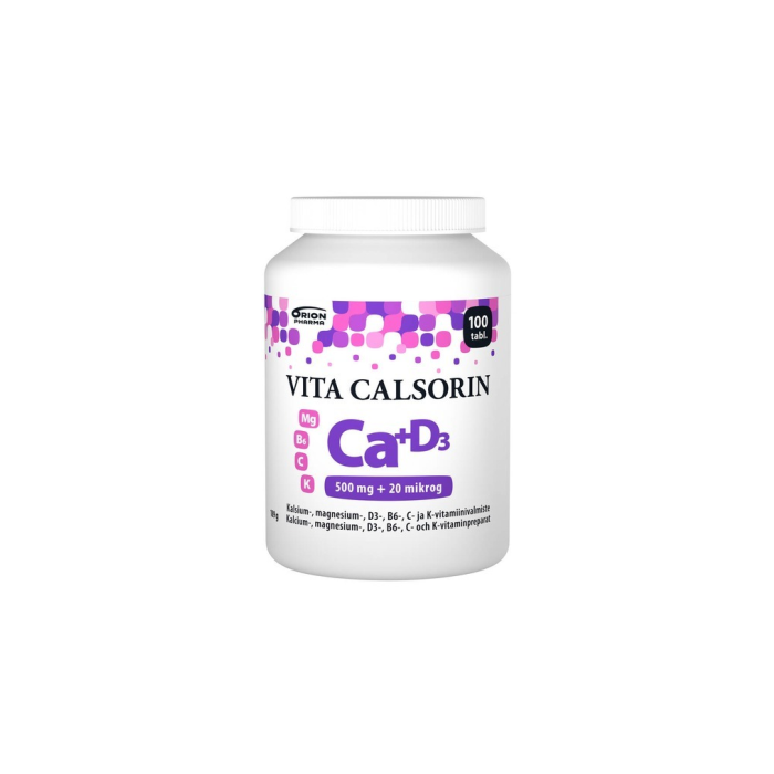Vita-Calsorin on monipuolinen luustoravinne, joka sisältää kalsiumin imeytymiseen, luuhun kiinnittymiseen sekä sekä luun muodostumiseen tarvittavia ravintoaineita. Kalsium on tarpeellinen luuston normaalina pysymiselle, D-vitamiini edistää veren normaalia kalsiumtasoa, magnesium ja K-vitamiini edistävät luiden pysymistä normaalina, C-vitamiini edistää kollageenin muodostusta rustojen ja luuston normaalin toimintaa varten. Helposti nieltävä, puolitettava tabletti. 1 helposti nieltävä tabletti sisältää 500 mg kalsiumia, 20 mikrogrammaa D3-vitamiinia, 150 mg magnesiumia, 30 mg C-vitamiinia, 1mg B6-vitamiinia ja 30 mikrogrammaa K-vitamiinia. Laktoositon (maidoton), gluteeniton, hiivaton, sokeriton.